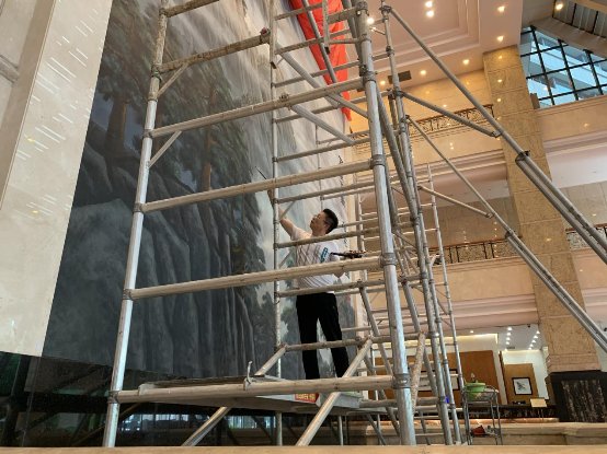 著名艺术家邢东应邀为深圳五洲宾馆接待大厅创作了一幅101平方米的巨幅油画《万象更新》他用了仅一个月时间就完成这幅巨作,如今悬挂在深圳五洲宾馆A厅的接待大厅,记者看到:展现在观众面前的这幅世界上最大的油画,叹为观止,气势磅礴,画面上方,一轮红日冉冉升起,照耀着延绵不断的山脉,云蒸霞蔚,万丈光芒。可以看出,画家用手中的画笔饱蘸油彩,洋溢着对生命的激情,抒发着对祖国山川大地的咏唱,画面一片生机勃勃的景象,充分体现了深圳改革开放经济特区生机勃勃的面貌。只有在现场才能感受到那扑面而来的宏伟气势。