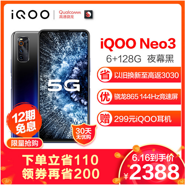 iQOO Neo3在当前手机市场上也有很高的热度,在“618网购狂欢节”首日,直接斩获了某东/某猫手机2.5-3K价位段销量&销售额双冠军,战绩显赫。而且在618购物节期间,用户最低2388就可以拿到iQOO Neo3,并且还有赠iQOO耳机、最高24期分期免息等福利等着大家。