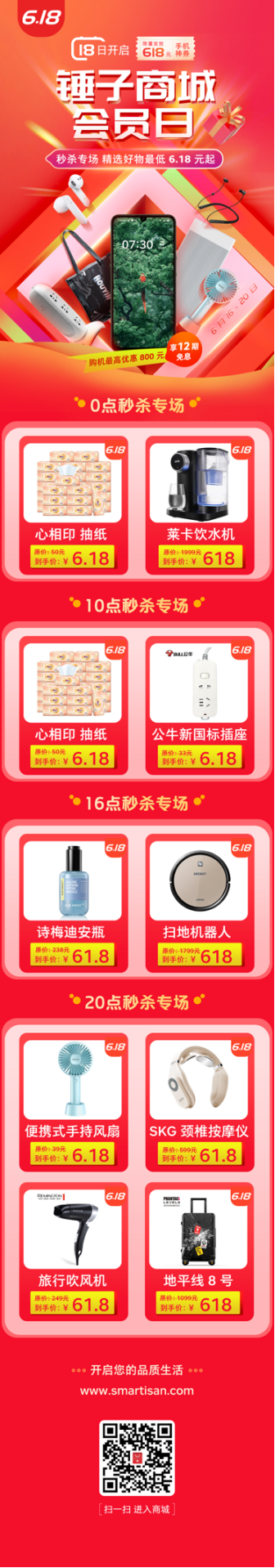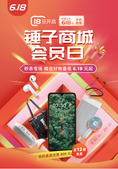 现有618促销福利加上6月坚果会员日活动,惊喜力度直接“加倍”!前往锤子商城购买坚果Pro 3,最高优惠800元,同时直享12期分期免息。18日巅峰时刻,除了超值的618元手机神券限量发放之外,锤子商城还将开启各种生活品质好物的秒杀专场,精选好物最低6.18元,助力粉丝用户们花更少的钱,畅享品质生活。