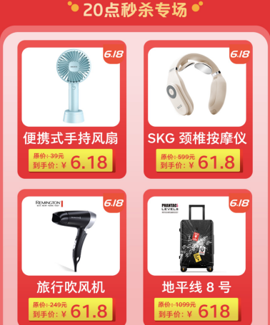 18日0点和10点,整箱装的心相印抽纸餐巾纸金装经典系列整点秒杀价6.18元!原价1799元的科沃斯扫地机器人 DH45直降500元,618促销价仅售1299元,18日16点整秒杀价只要618元!此外还有杨洋亲选的SKG K5 颈椎按摩仪,原价599元,20点整劲爆秒杀价只需61.8元!如此优惠力度可谓直接秒杀“真五折”。