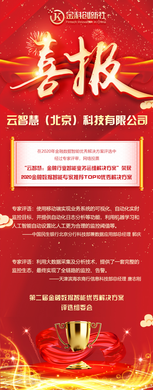 近日,由中国银行业协会金融科技专业委员会指导,金科创新社主办的“第二届金融数据智能优秀解决方案评选”结果揭晓。经过建设银行、农业银行、民生银行、中国人寿、太平洋保险等大中型金融机构的数十位IT专家的严格评审、打分和答辩环节的详细问询,云智慧“金融行业智能业务运维解决方案”获得“2020金融数据智能·专家推荐TOP10优秀解决方案”和“2020金融数据智能·运维创新优秀解决方案”两大奖项。