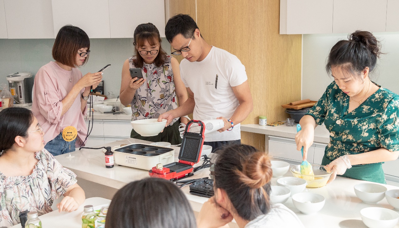 活动现场BRUNO有幸邀请到具有多年经验的美食达人温樂老师,和大家分享桃花酥的做法,还邀请到法国留学回来的美食老师为大家讲解厚烧舒芙蕾的技巧。其中桃花酥分享时候,所有的小伙伴都参与了互动,从酥皮擀制,到桃花形状的装点,从桃花蕊的细节掌握,到烘焙温度、时间的把控,每一步的参与,都伴随着桃花酥成品出来的惊喜。另外用BRUNO料理锅做厚烧舒芙蕾时,老师现场讲解了舒芙蕾怎么做成厚烧状态的技巧,包括在加热时加水的目的,都让现场的气氛持续升温,尤其是在拿出BRUNO和姆明联名定制款轻食机时,现场做出来姆明精灵小饼干,精致的形象,卡通的人物,都让小仙女们倾心不已,尖叫连连。