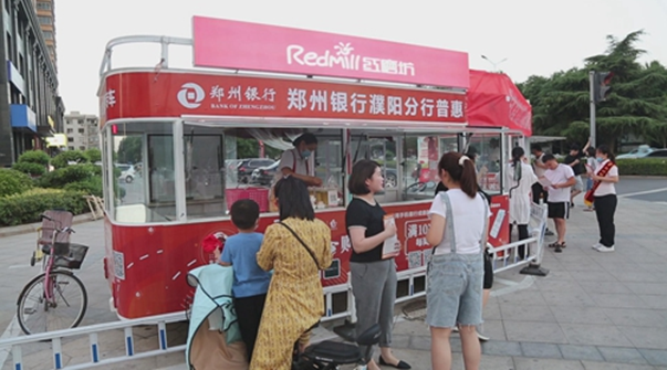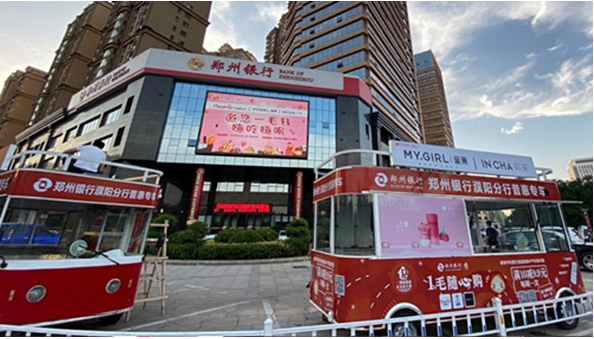 为了释放“地摊经济”活力,助力经济复苏,恢复城市的烟火气,郑州银行濮阳分行积极响应政府号召,联合红磨坊食品、蜜菓饮品、印茶饮品等广受当地群众喜爱的品牌,在分行大楼门前推出普惠专车,为地摊经济加一把劲儿。