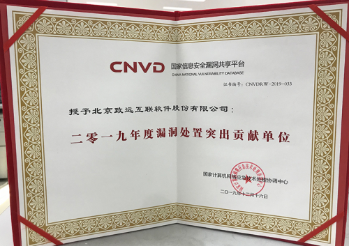 CNVD(国家信息安全漏洞共享平台)为表彰过去一年致远互联在漏洞信息报送和处置方面所作出的突出贡献,也为其颁发了“2019漏洞处置突出贡献单位”,致远互联亦是去年唯一一家获得该荣誉的协同管理软件服务商。