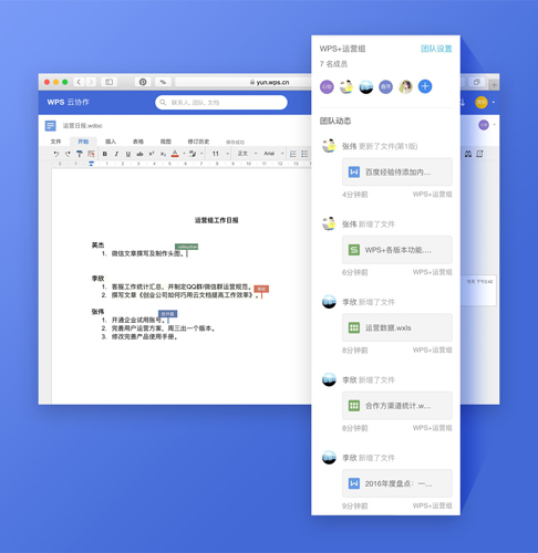 WPS云协作是WPS+云办公最亮眼的特色之一,旨在帮助企业完成“随时、随地、高效、安全”的办公服务信息化建设,搭建跨平台、跨设备、跨团队共享协作和协同办公。基于云储存和云计算技术,WPS云协作最大的特色是完全摆脱“本地”,所有存储在WPS云办公的文件只存在于云端,不占用电脑或手机内存。在WPS云协作中,企业内部的团队成员可共同完成一份文档的撰写和编辑,每位成员的编辑不仅清晰可见,而且所有版本都会实时自动保存。