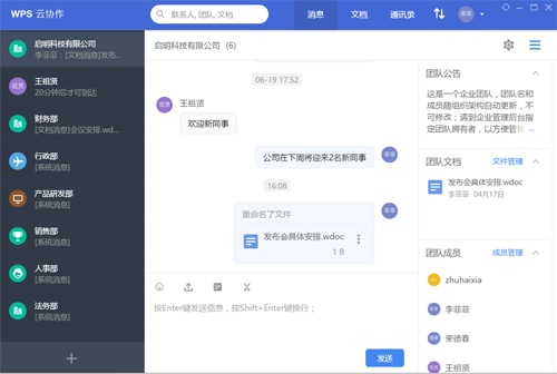 除了共同撰写和编辑文档,WPS云协作还能根据企业组织架构为每个部门自动创建聊天群组,团队成员除了可在群组里直接发起群聊外,还能发起一对一私聊。聊天窗口不仅可以发起协作文档,还可以边沟通边记录要点。