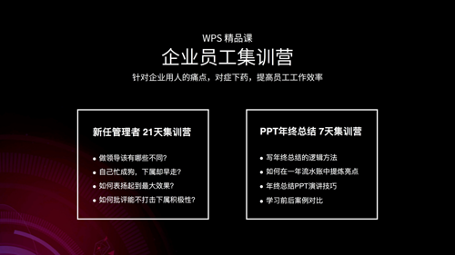 利用午休或短暂的空闲时间,小微企业员工便可在线看完一个营销计划。对于进入稳定发展期的小微企业而言,WPS精品课可根据公司的需求,有针对性地推出长期的培训计划,或临时的急训等。在节省成本的同时,WPS精品课又能给小微企业员工提供最优质的培训。