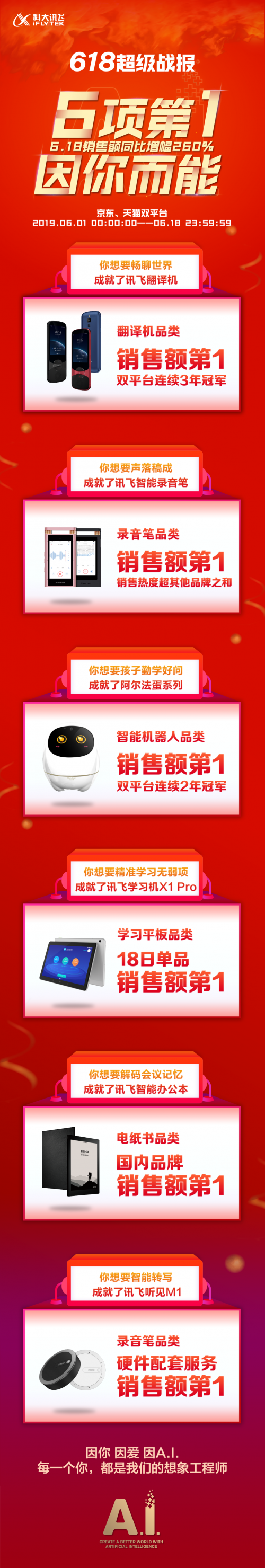 产品用心,技术领先,自然会得到业内和用户认可。科大讯飞在此次618年中大促中所获得的成绩, 也验证着人工智能产品正在规模化落地。在未来,期待科大讯飞能够创造出更多让消费者满意的人工智能产品,引领人工智能行业发展,让世界因A.I.而能。