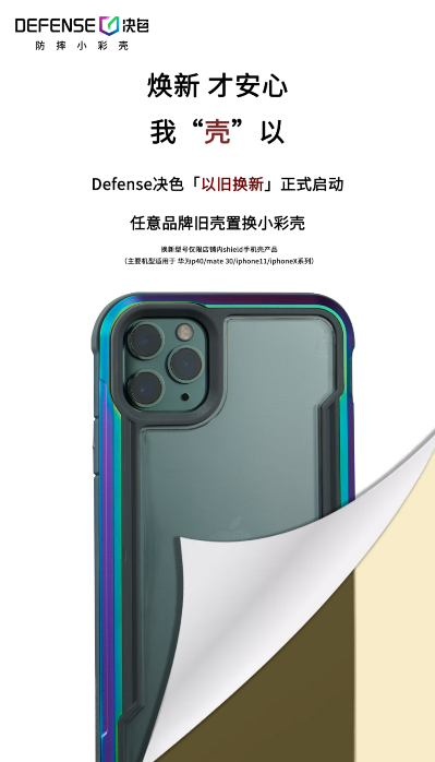 5月中旬,Defense决色官方推出最新的“手机壳焕新计划“,用户凭任意一款手机壳都可以置换一只决色明星产品——独一无二极光色的防摔小彩壳,此次”焕新计划“也将成为Defense决色品牌史上最浓墨重彩的大事件之一,并将长期持续下去。