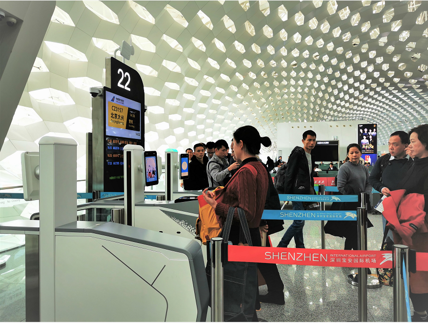 ▲深圳宝安国际机场AI人脸识别过安检的旅客