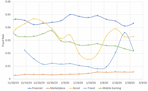 金融平台上(深蓝线)的欺诈行为相对没有发生明显变化,但我们可以看到社交平台上(黄色线)的欺诈行为呈明显上升的趋势,尤其是在2月份,当时新冠病毒疫情的爆发刚刚引起媒体的高度关注。欺诈行为的激增紧随典型的节后衰退,在一年中的这个时候并不常见。疫情期间,每天都有新的网络钓鱼诈骗正在发生,这些诈骗试图利用疫情,诱使毫无戒心的受害者提供个人信息,购买假冒产品等,而一些风控能力不足的社交平台就成了此类欺诈活动的温床。