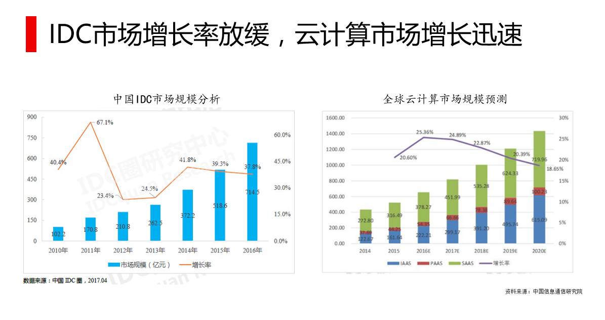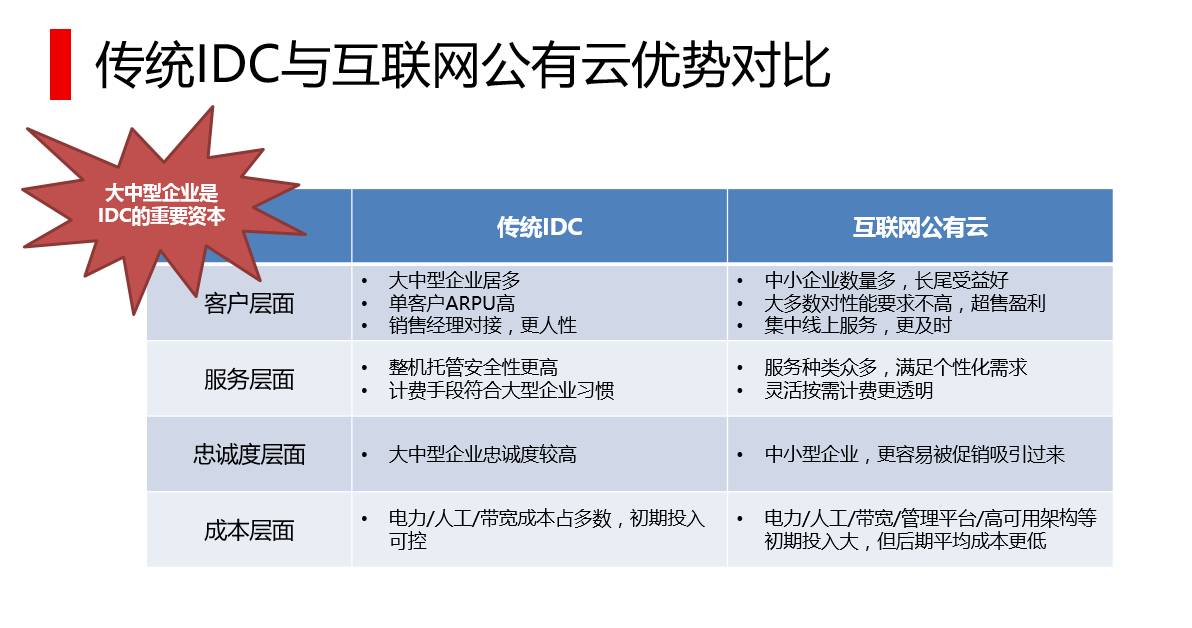 邱洋表示,目前,IDC市场增长放缓而云计算市场增长迅速。传统IDC与公有云竞争是处于弱势位置的。在这样的背景下,如何提升IDC价值甚至形成竞争优势,不妨从自身的核心资源,即大中型企业客户入手。