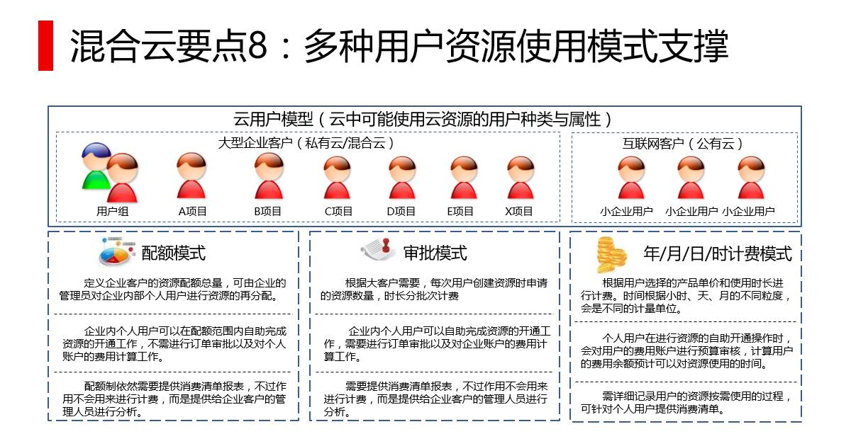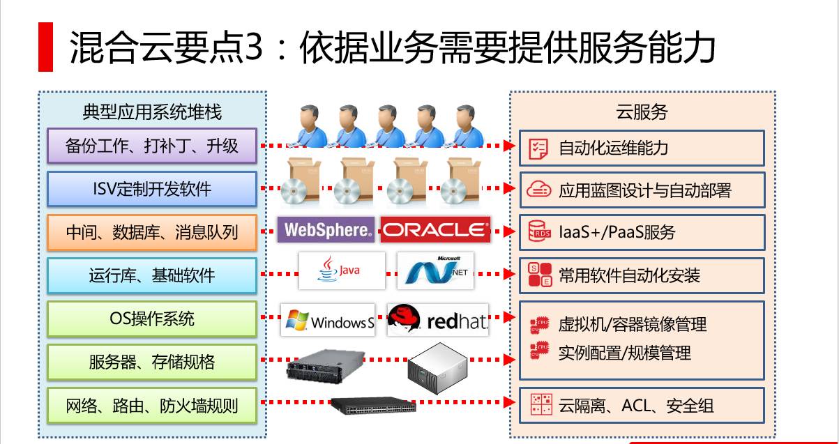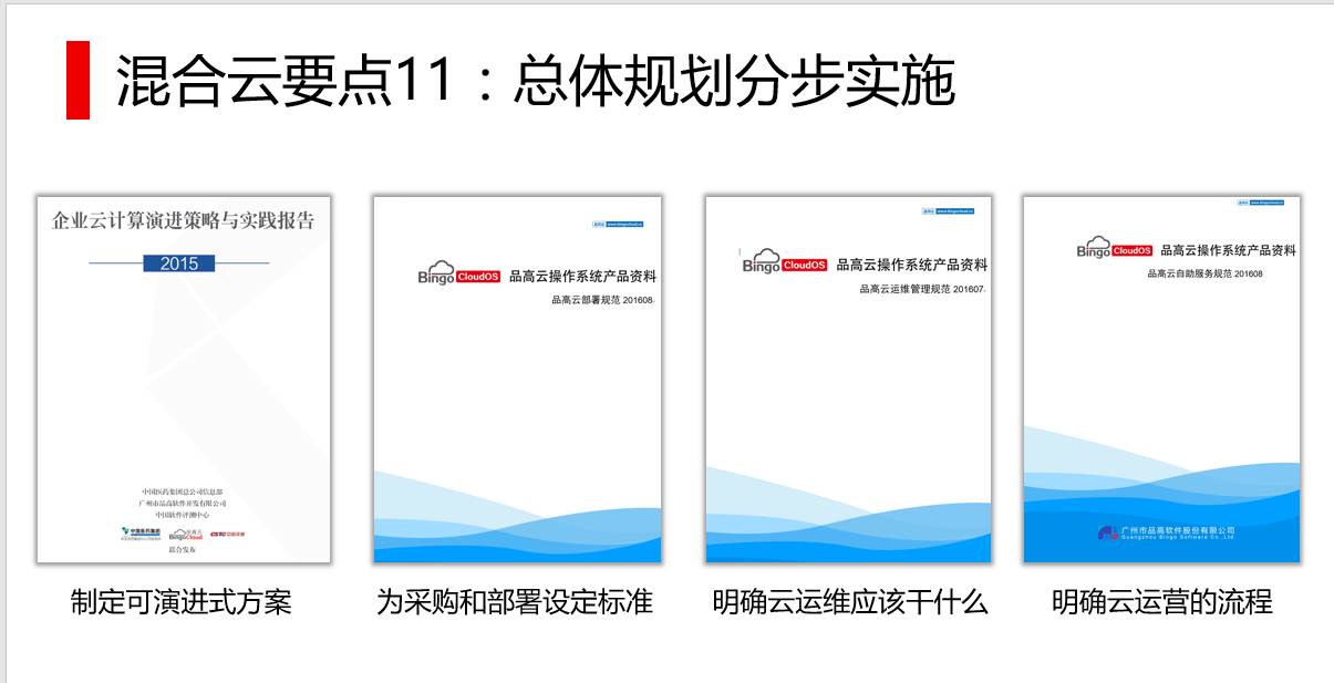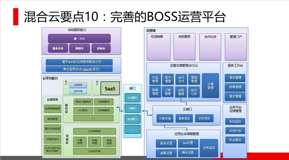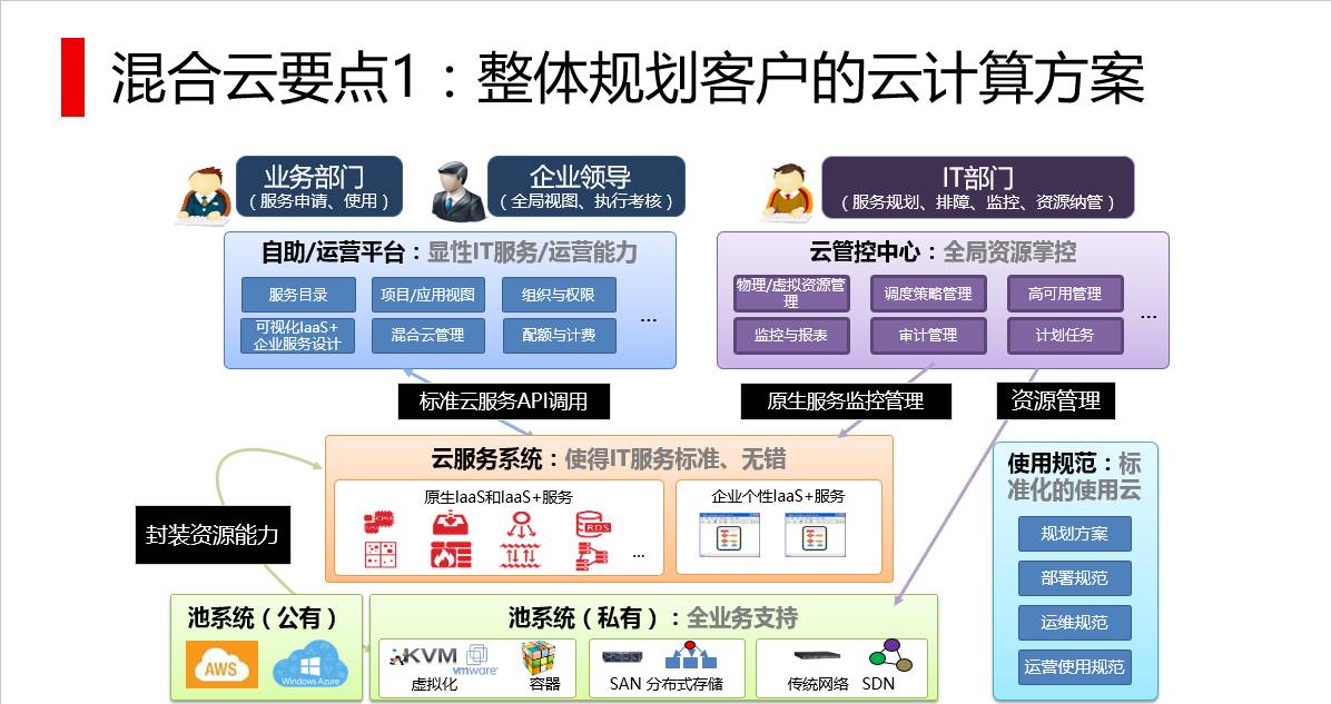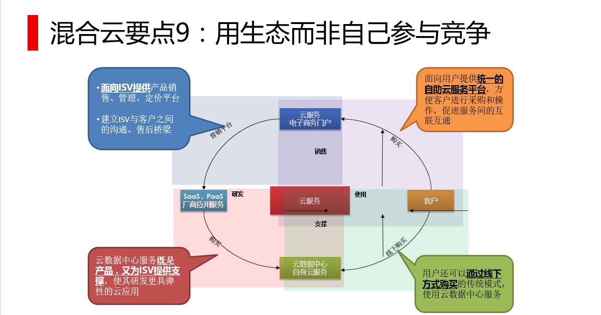 1、整体规划客户的云计算方案;2、网络能力是关键;3、依据业务需要提供服务能力;4、混合的云,统一的服务;5、为客户提供个性化创造云服务;6、统一的服务目录+计费+应用视图;7、构建全局的IT视角;8、多种用户资源使用模式支撑;9、用生态而非自己参与竞争;10、完善的BOSS运营平台;以及最重要的,11、要总体规划然后分步实施。