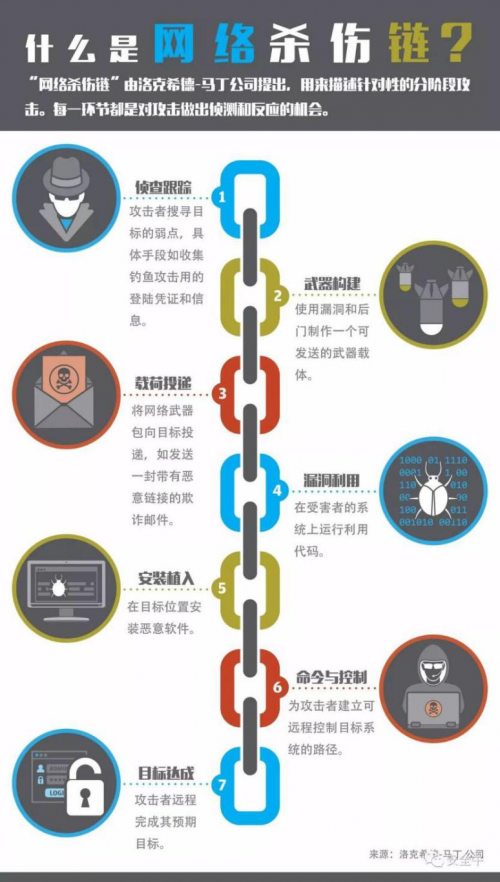 在“七步网络杀伤链”理论中,最有参考价值的是2011年洛克希德马丁发布的网络杀伤链模型,在其模型中更为关注“人”的因素。
