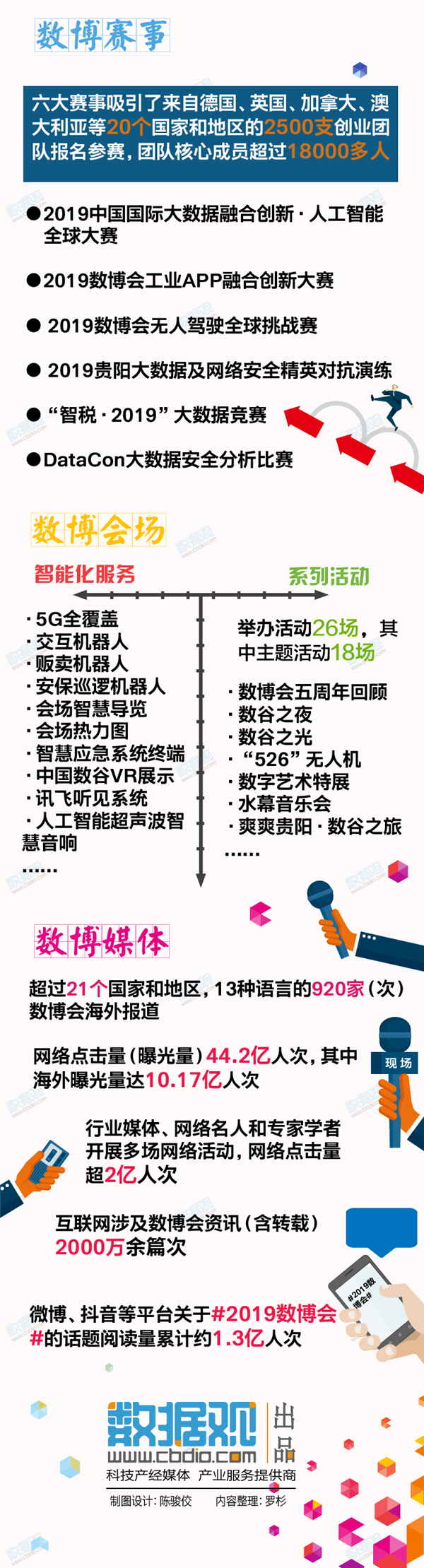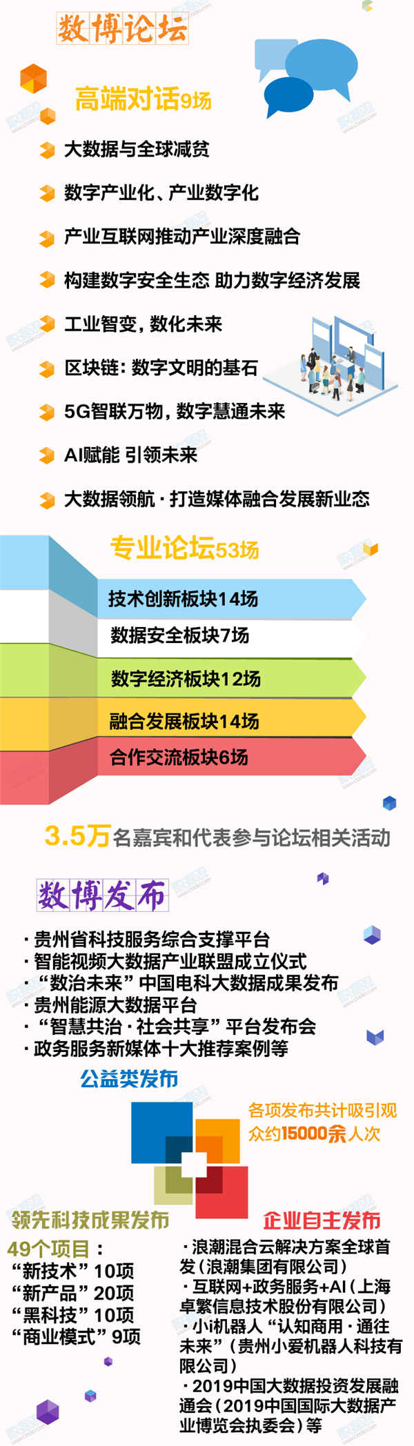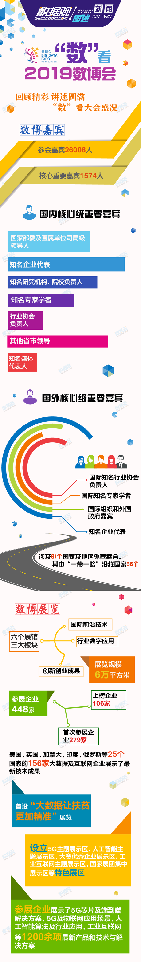 2019数博会于5月26日至29日成功举办,以“创新发展·数说未来”为年度主题,围绕“一会、一展、一发布、大赛及系列活动”展开。回顾精彩,讲述圆满。让我们通过数字来体会2019数博会的盛况!