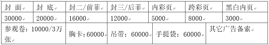 为了配合在展览期间宣传及让客户了解并在会后能与之沟通联系,组委会将精心编印大会会刊,会刊规格:145mm×210mm.注:广告费用须全额一次付清,以付款先后顺序进行安排。单位:元(RMB)