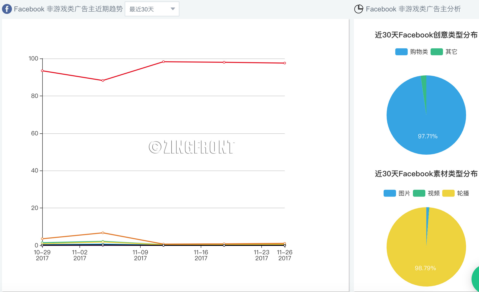 根据SocialPeta全球电商大数据显示,截止目前在主流渠道FB、Twitter、Youtube上已有几亿各类广告数据,有几千万电商品牌广告数据。电商类广告在FB渠道近30天内在非游戏类广告的占比已然攀升至97.71%.