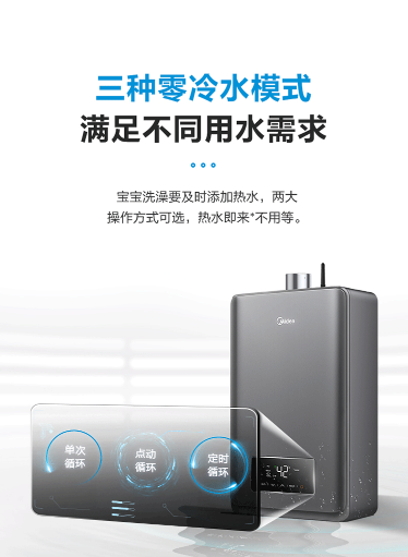 美的GTS燃气热水器,不仅实现了开机无冷水,还针对了用户们的不同用水需求,设置了三种零冷水模式,满足不同用水环境。