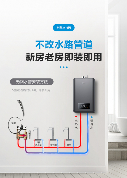 在安装上面,过去传统的零冷水热水器对无预埋回水管路的户型来说,安装十分受限。美的GTS燃气热水器针对老式户型无预埋回水管的痛点,通过加装“H专利阀”单向阀,链接冷热水路形成回水管路,让老式户型也能实现开机无冷水,全屋热水即开即用。
