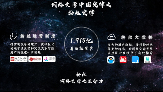 同时,“只有更好地利用‘粉丝定律’,中国网络文学产业才能显现出真正持久的生命力”吴文辉如是说。为让用户活跃起来,阅文集团将互联网视为“沟通器”,创造打赏等粉丝运营制度,让读者更有参与感,更乐于和创作者互动。此外,阅文还建立了互动社区,鼓励读者与作家、编辑进行交流。背靠大数据分析技术,阅文集团1.918亿月活跃用户的价值得到升级,不仅推动内容品质提升,更为定向推送,以及后期IP的遴选、制作以及宣传提供重要依据。