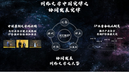吴文辉表示,“泛娱乐需求日趋庞大、多元,‘单兵作战’模式必然失败,‘协同开发定律’才是关键。”为此,阅文已携手 200 多家内容改编伙伴共建生态,深度介入全产业链,力求最大化实现IP价值。在此过程中,阅文集团秉持“创新探索”理念,推出了“中国原创文学风云榜”“IP共营合伙人”制度等一系列有益商业模式,提升IP开发精品率。未来,阅文计划将高度分散的中国泛娱乐产业更加融合、串联起来,进一步释放版权的变现潜能,采用成熟高效的方式,来决定内容改编过程中的参与程度,让IP的开发迈向长线、高效、优质。