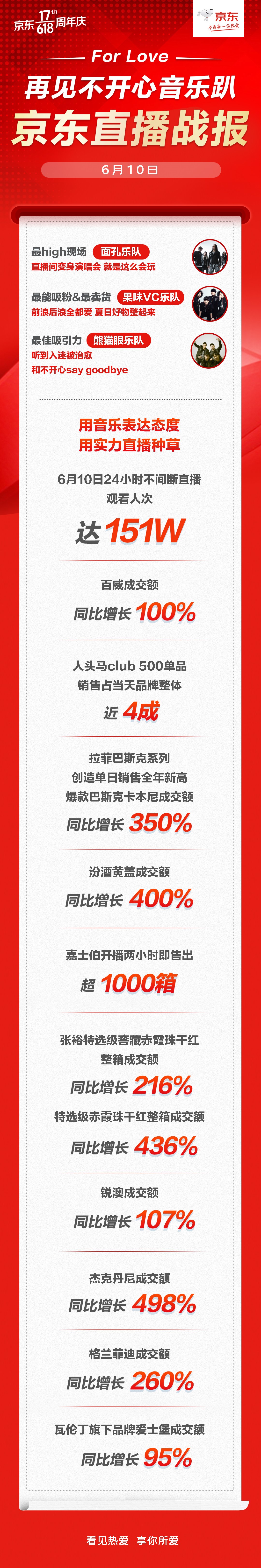 为解决大家长期宅家无法看到现场音乐演出的困境,6月10日0点,京东直播带来了一场24小时不间断直播的“再见不开心音乐趴”,邀请了果味VC乐队、面孔乐队、熊猫眼乐队、Miss Mix等知名乐队嗨翻京东直播间,同步凭借自己的音乐实力向观众种草酒水类单品。直播当天,不仅直播观看的人次达151万,就连乐队种草的酒水类单品销量也获大幅提升。