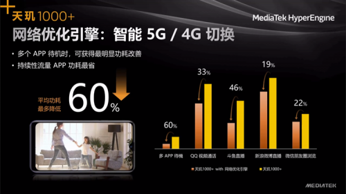 另一痛点,网络切换时的稳定性也严重影响用户体验。天玑1000Plus内置HyperEngine 2.0优化引擎,为用户提供了最完整的“来电不断网”解决方案,无论是在5G网络下视频通话还是游戏开黑,不会因为来电呼入造成网络连接的中断卡顿。同时,这项技术还可以根据用户场景需求完成5G和4G的智能切换,例如游戏时5G在线,待机时切换4G,从而保证性能和续航之间的平衡体验。