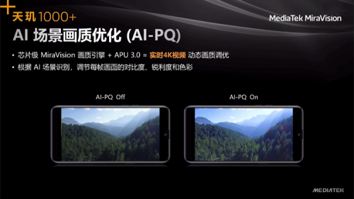 此外,联发科MiraVision画质引擎还可实现AI场景画质优化,根据AI场景识别动态调节每帧画面的对比度、锐利度和色彩,实时进行4K视频的逐帧画质调优。