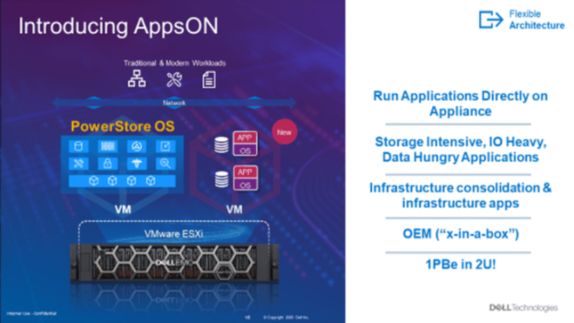 PowerStore是一个有趣且能力非常强的新型统一存储系统,可以被配置为在传统模式或hypervisor模式下运行,从而提供了额外的灵活性。在传统模式下,PowerStore作为专用的企业级存储阵列运行,但在hypervisor模式下,应用程序可以直接在PowerStore设备上运行,这就是戴尔易安信称之为“AppsON”的新功能。