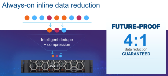 在容量利用率方面,PowerStore转向硬件辅助压缩,不仅使存储控制器压力减轻,使其能够驱动更高的吞吐量,而且在应用层面也没有明显的延迟。结合戴尔易安信通过PowerStoreOS提供的优化,该厂商现在已经将混合工作负载的数据缩减率保证从3:1升至4:1。