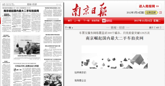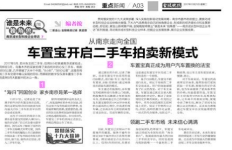 11月17日,南京日报、南京电视台、南报网、金陵晚报、南京新闻广播等南京市属媒体,走进总部位于南京的全国最大二手车拍卖平台——车置宝二手车拍卖网,对创始人兼CEO黄乐等企业高管进行专访,聚焦车置宝矢志创新的企业发展历程。