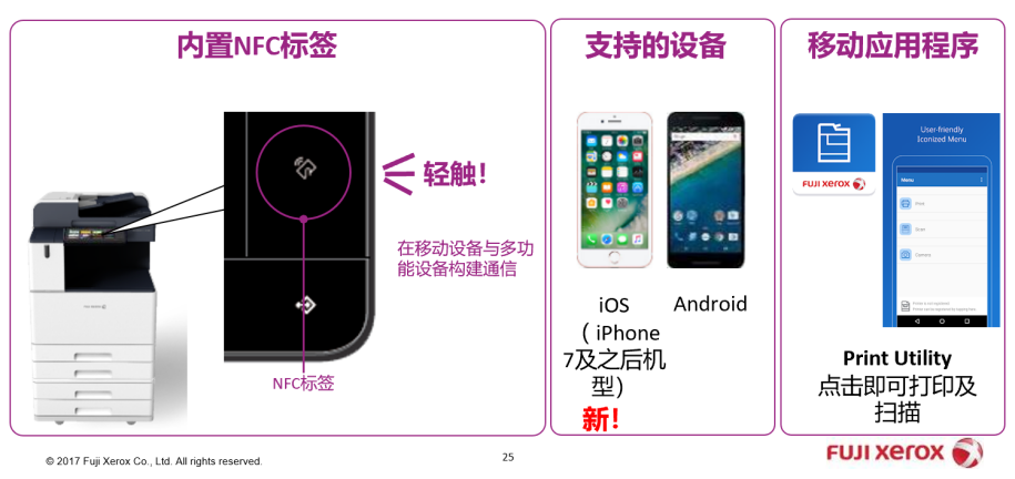 数字化转型不只是技术层面的改变,更是工作方式的全新变革。 富士施乐的智能型彩色数码多功能机ApeosPort-VII 系列能助力企业改变传统的工作方式,实现真正的移动办公。 其近场通信NFC技术 —— 只需用智能手机轻触设备,就能直接登录操作,如:打印iOS和安卓手机的相册照片或网页,或直接在现场拍照并打印。此外,智能手机也可作为彩色数码多功能机的便携式操作面板,在手机APP上操控设备进行复印、扫描、传真等;通过在手机上设置操作步骤,保存常用功能,即可在不同地点或不同楼层的同一网络设备上用智能手机操控,即便出差也能非常便捷的进行复印,扫描或传真,从而实现真正的移动办公。