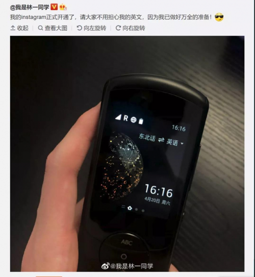新晋“小鲜肉”林一,在都市青春爱情剧《致我们暖暖的小时光》中饰演学霸主角顾未易,俘获大批迷妹芳心。其实他还有着另一个身份,就是讯飞翻译机隐藏的忠实粉丝。前不久,林一在微博上盛赞讯飞翻译机,告诉大家“再也不用担心他的英语了。”特别值得一提的是,林一使用得还是讯飞翻译机独有的方言翻译功能,东北话与英语之间也能轻松互译。