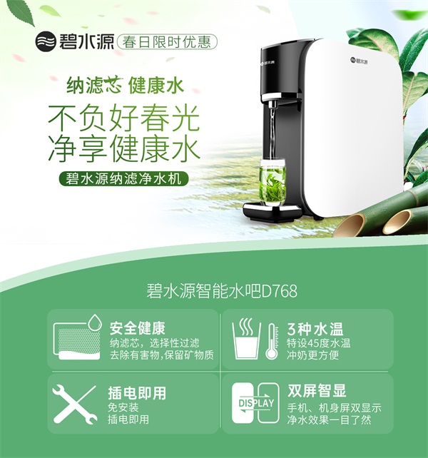 例如碧水源的热销产品纳滤直饮机D768采用一体式复合纳滤芯,在保障饮水安全健康的同时,还搭载智能物联技术,通过“高清显示屏+手机APP”即可随时了解净水机进、出水TDS值和滤芯使用寿命,让每一口水都喝的安心。还有开水、冲奶水、常温水三种水温可选,满足不同人群的饮水需求。而且碧水源纳滤直饮机D768运行压力低、通量大,比传统净水机节水约3倍。免安装设计,插电即用。拥有它,足不出户轻松享受健康水为您带来的品质生活。