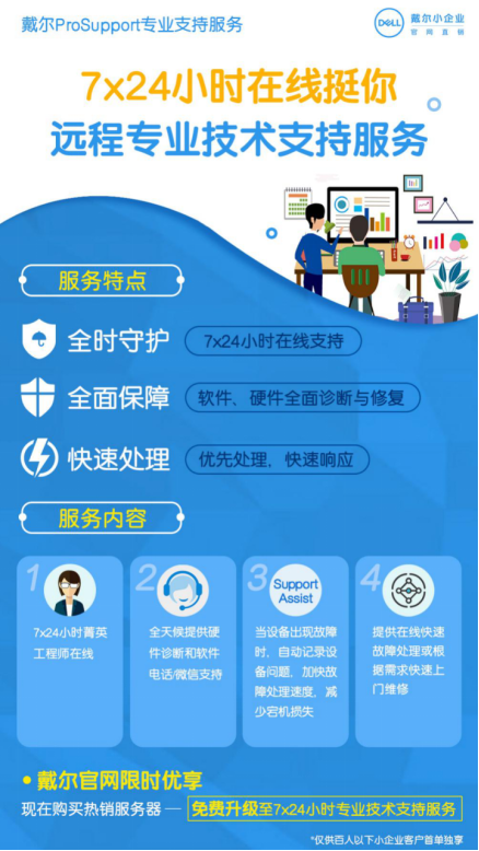 现在访问戴尔小企业官网,购买戴尔服务器即可免费升级7*24小时专业技术支持服务,全面保障软件、硬件的诊断与修复,Hold住企业业务。
