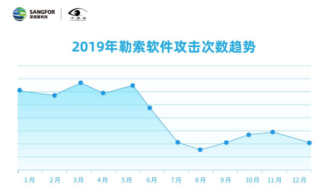 根据报告显示,2019年勒索软件的攻击呈现出新的态势。首先,攻击频率有所下降。虽然在5月份以前一直保持较高的攻击频率且在3月、5月异常活跃,达到了当年攻击次数最高峰,但6月份开始攻击频率明显降低,2019年攻击呈整体下降趋势。其次,报告显示勒索软件也展现了明显的新目标转换行为。其将过往大量的针对普通用户的攻击转向了更加“精准”的面对政企机构的攻击。