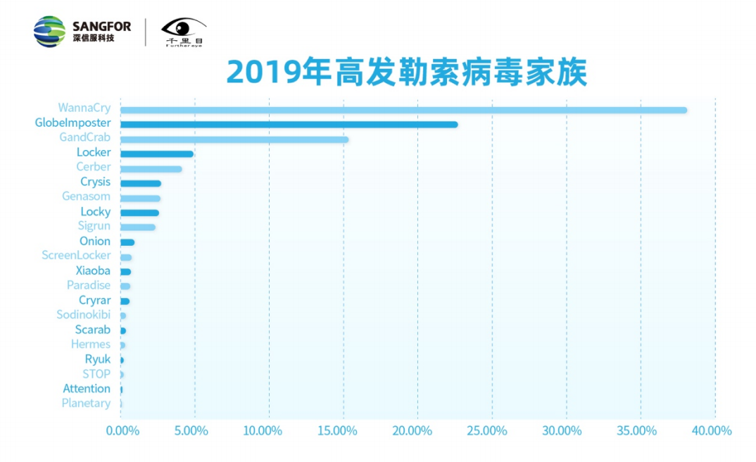 近年来新的勒索病毒仍然层出不穷,勒索病毒的威胁也不断发展。国内高发的勒索病毒较多,主要的家族有WannaCry、GlobeImposter、GandCrad等。其中,WannaCry虽然已经爆发许久,但根据深信服云端数据显示,其在2019年高发勒索病毒家族中占比近40%,是国内最高发的勒索病毒,每天依然有大量攻击警报。