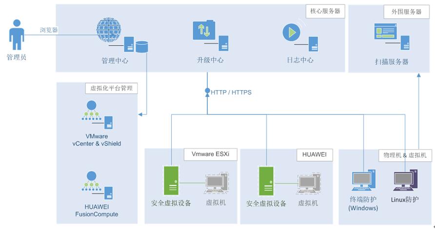 瑞星虚拟化系统安全软件采用分布式的体系结构,结构清晰明了,管理维护方便。整个防病毒体系是由五个相互关联的子系统组成:管理中心、安全虚拟设备、日志中心、升级中心、查杀协作。各个子系统协同工作,共同完成对整个虚拟化平台的病毒防护工作,为企业级用户的虚拟化系统提供全方位防病毒解决方案。