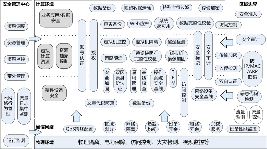 在计算环境方面,云平台应提供安全加固的操作系统及镜像、虚拟机隔离、双因素身份验证以及访问控制、安全审计等措施。