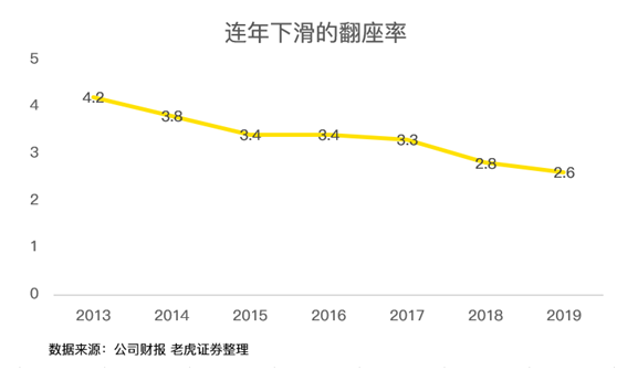 但上市后,此指标连年下滑,2018年之前,还能保持在中上游水平,但这两年,翻座率已经泯然众餐矣!