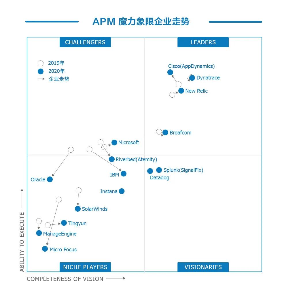 首先,值得注意的是,2020 Gartner APM 魔力象限相对于2019年,除了听云和New Relic两家企业在整个象限中处于上升状态,其他企业在象限中的位置都在一定评分维度呈现下降趋势。 具体表现可能是Ability to Execute(执行层面,即当前产品、服务、销售等表现)坐标轴的评分下降,或为Compleness of Vision (战略层面,即未来愿景的清晰完整性)坐标轴评分的下降,亦或两个坐标轴评分的同时下降。