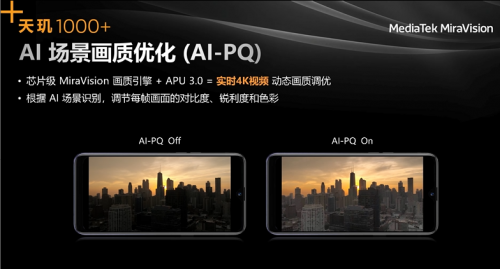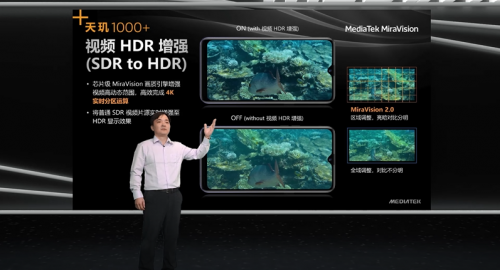 MediaTek天玑1000+支持HDR10+,其独家的芯片级MiraVision画质引擎还可以带来超越HDR10+画质效果。MiraVision通过逐帧优化视频画面的动态范围和图像细节,让原生4K HDR10+视频画质更加生动逼真,色彩呈现更细腻,画面层次更丰富,带给5G时代手机用户更“出色”的全新画面质感和高清视频,实现在5G时代随时随地可享受“高清影院”的终端体验。