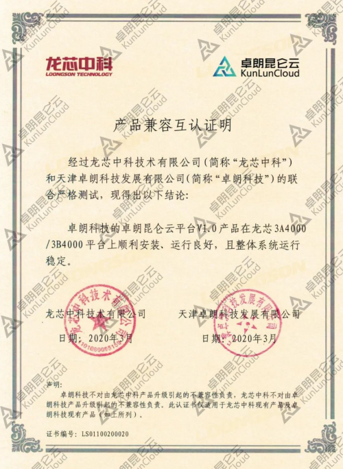 近期,卓朗昆仑云再度宣布好消息,旗下卓朗昆仑云平台V1.0与龙芯中科的龙芯3A4000/3B4000平台完成了兼容性互认证工作,测试结果表明双方产品在功能和兼容性等方面表现良好,且整体系统运行稳定。