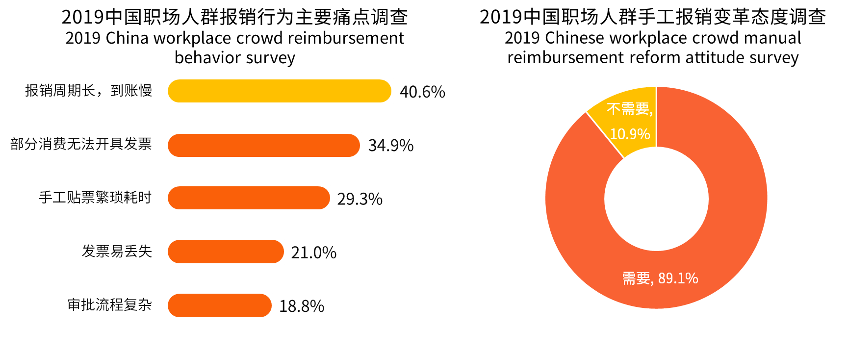 iiMedia Research(艾媒咨询)数据显示,职场人群报销痛点颇多,排在前三的是报销周期长、到账慢,部分消费无法开具发票以及手工贴票繁琐耗时,占比分别为40.6%、34.9%和29.3%。针对当前手工为主的报销模式,89.1%的受访者认为该模式需要变革。