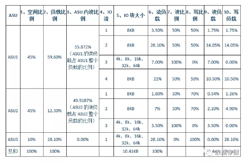 浪潮存储根据SPC Benchmark Official Specification,制作了一份简单易懂的表格,如下图。三个ASU的【9、读负载】总和为39.44%,【10、写负载】总和为60.56%,两者之和为100% 。