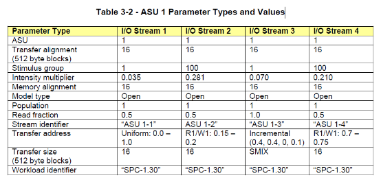 三个ASU(Application Storage Units,业务应用存储单元),分别提供45%、45%、10% 存储空间比例,总和为100%。每个ASU有着不同的IO流, ASU 1是Data Store,例如它的第三类IO流,它的IO块大小不是固定的,从下表能看出,它是从8个block到128个block不同Transfer Size的组合;每个block是512个字节 ,因此IO块大小是从4k到64k。不同ASU的不同IO流,都有着各自的流负载,并规定了读写比例。所有IO流(总共8种)的读负载总和与写负载总和之和为100% 。