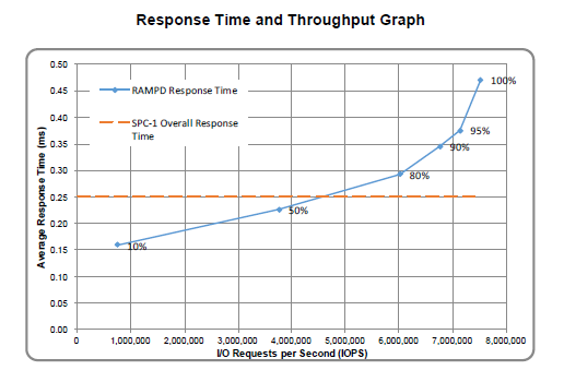 在《A32014_ES》这个PDF里,能看到几乎所有的重要信息。包括752万的SPC-1 IOPS;SPC-1 性能方面的性价比为$386.50/SPC-1 KIOPS,容量方面的性价比为$10.58/GB;平均延时 0.472毫秒,总体响应时间为0.251毫秒;数据保护方式为RAID 10,此种保护方式能防止单点故障,但对性能有减损,因此能达到752万IOPS殊为不易。