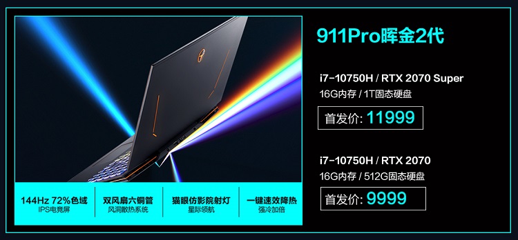 911 Pro晖金2代,采用最新十代酷睿i7-10750H高性能处理器, 澎湃动力随芯而至,同时搭载最新RTX2070、2070Super光追系列高端游戏专用显卡。除去内核芯片的升级,911 Pro晖金2代更搭载了144Hz顶级3ms响应电竞屏、全新听声辨位黑科技Nahimic音效系统,在三维环流风洞散热系统的帮助下,能给骨灰级游戏玩家带来前所未有的畅爽体验。