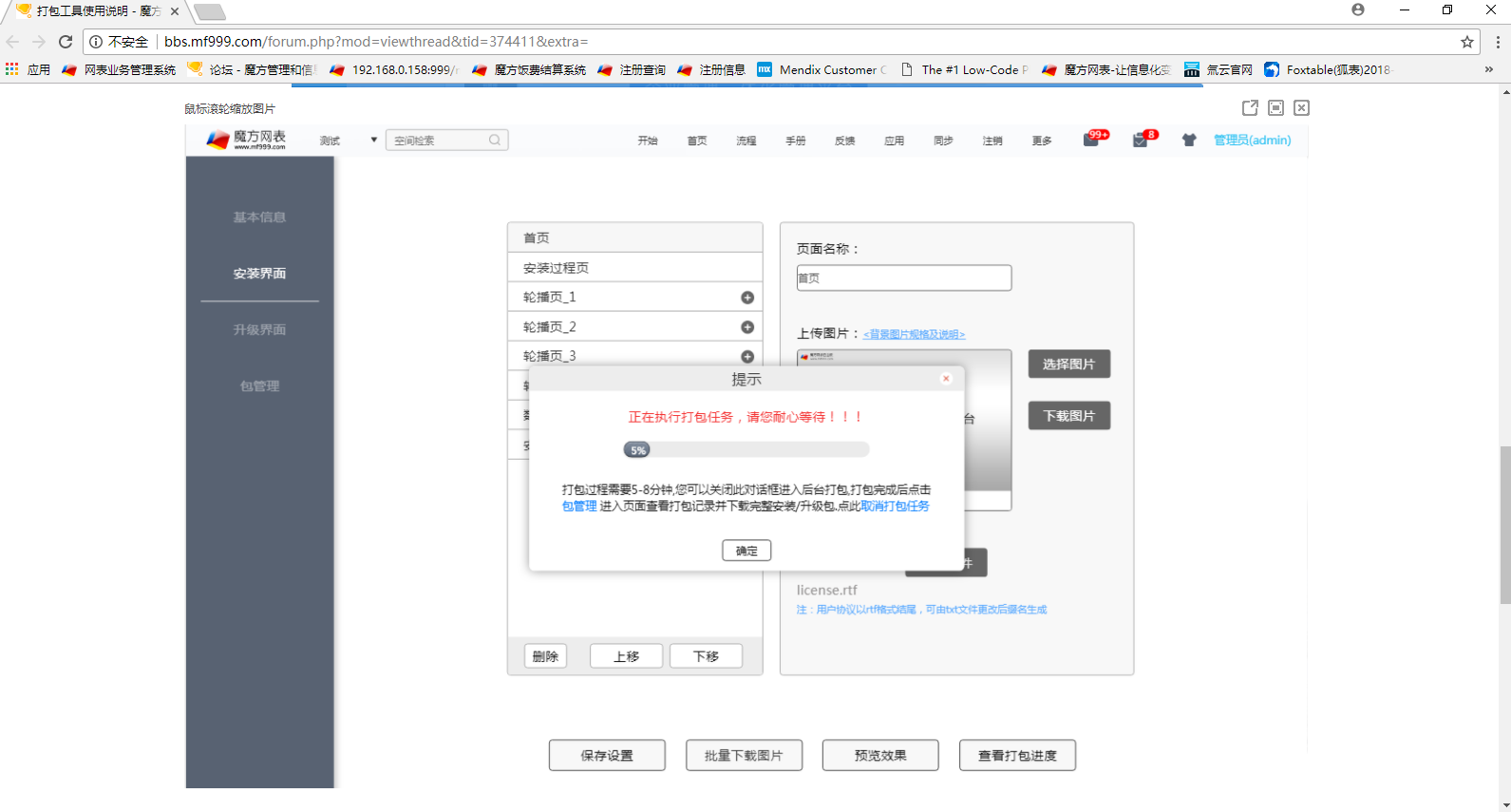点击下方的“打包正式包”按钮,进入正式打包状态。打包过程可以关闭对话框进入后台执行模式,也可以取消打包。打包所需时间随机器性能而定,请您耐心等待……