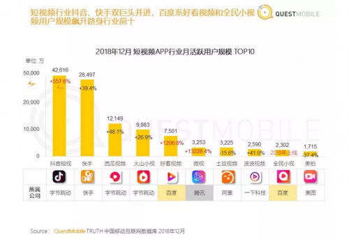 根据《中国移动互联网2018年度大报告》显示,短视频已经超越了在线视频成为仅次于即时通讯的第二大行业,其中百度系的好看视频以7501万的月活用户规模飙升跻身行业前十,俨然已进入短视频产品第一梯队。
